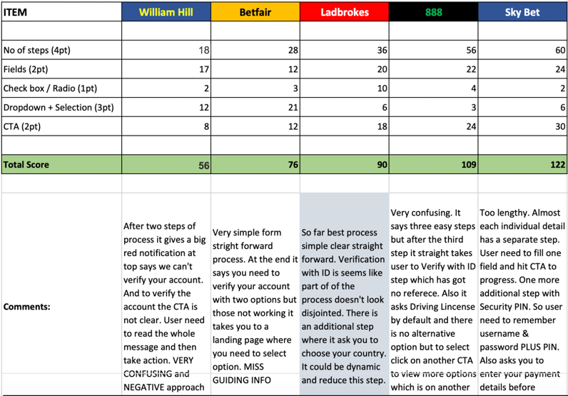 I have used different method to compare the same experience with our competitor and score them to find out who’s doing best and worst. Doing this I can set a benchmark where we trying to reach and create solution towards to achieve that.