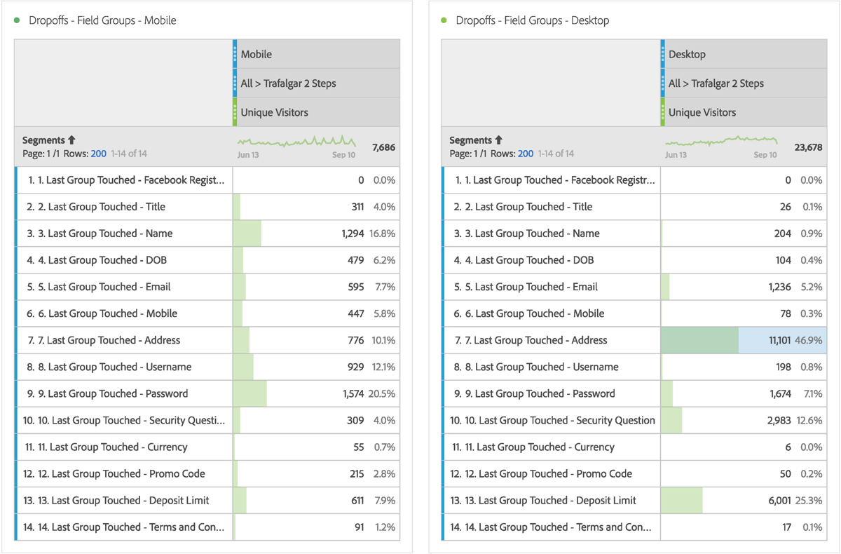 We found out at what stage users are leaving and why through anlysing the last months data. The data was inconsistant for Mobile and Desktop which gave me another reason to do competitor research and usability testing.